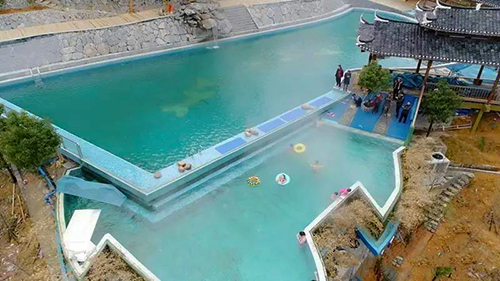 湖南懷化溆浦雪峰山楓香瑤寨景區(qū)恒溫泳池工程分為三個泳池:一個大泳池,一個楓葉池和一個按摩池。