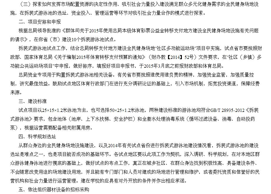 體育總局辦公廳關(guān)于開展第二批拆裝式游泳池建設(shè)與運營管理試點工作的通知!