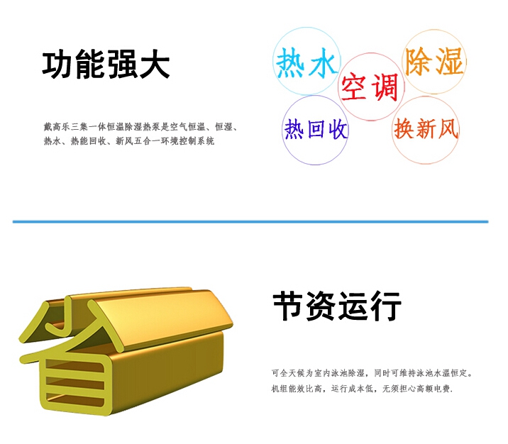 戴高樂三集一體恒溫除濕熱泵是引進英國技術(shù)的室內(nèi)泳池五合一環(huán)境控制系統(tǒng)。具有對室內(nèi)空氣除濕、對泳池加熱、熱量回收、空調(diào)制冷、新風(fēng)排風(fēng)等多種功能。投資成本低,COP熱效率達到480%,輸入1度電能獲得4.8度電相等的除濕、加熱、空調(diào)功率,同時是唯一能除PM2.5的熱泵,讓您的泳池遠(yuǎn)離霧霾,是室內(nèi)恒溫泳池必不可少的節(jié)能環(huán)保產(chǎn)品,是現(xiàn)代化泳池的心臟。